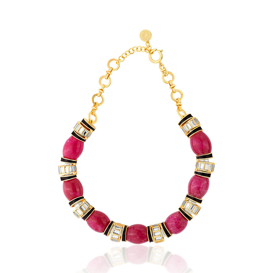 This earrings-and-ring duo will work so well with hues of yellow. Both of them feature vibrant pink jades and dotted with our signature mirrors along with 18-karat gold-plating.