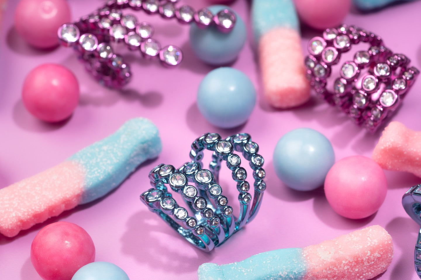 Style tip: Go all out and match your jewels with bold, glittery eyes and a bright pink dress.