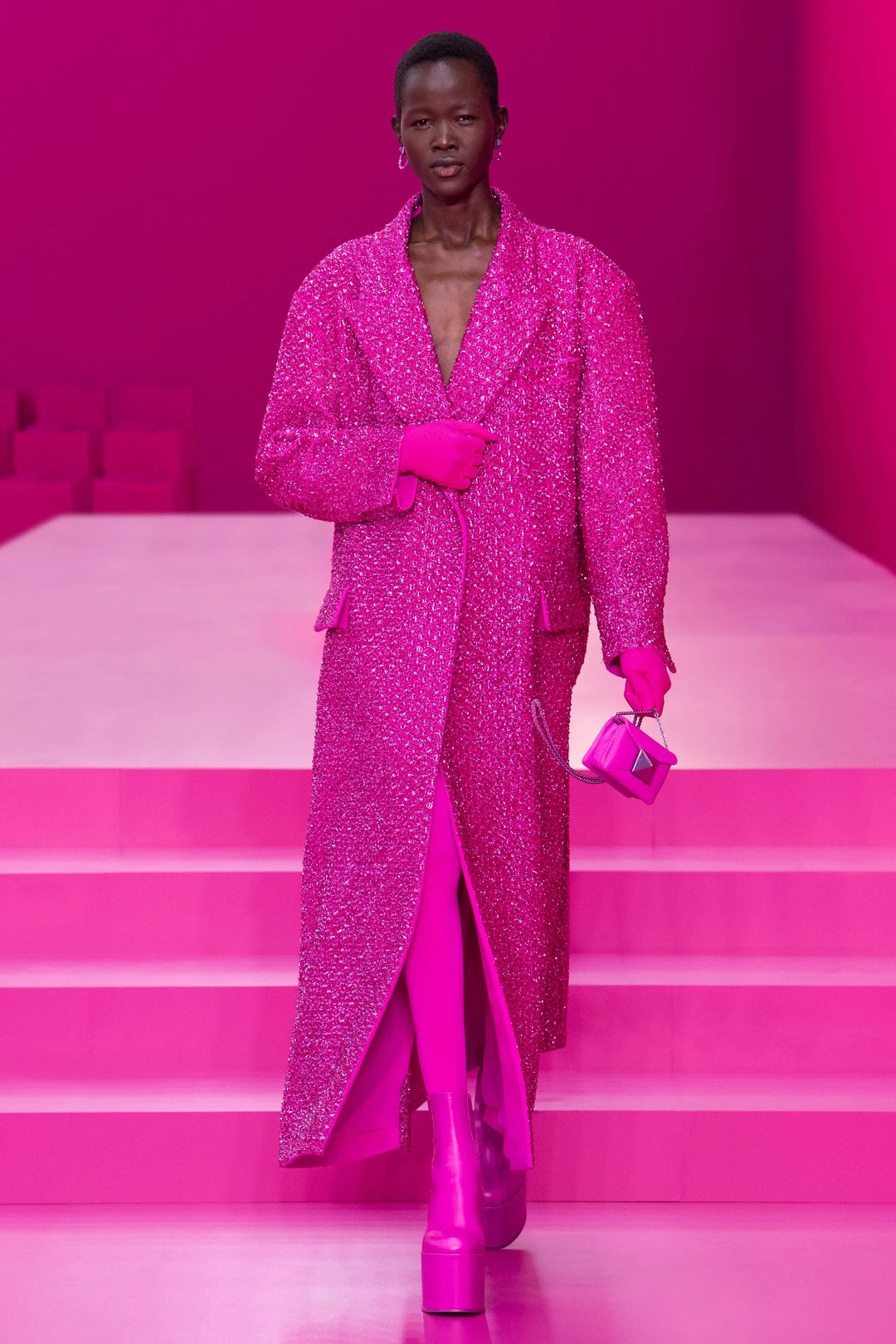 The bold pink reflects the global zeitgeist. An exuberating color that pulses through a joyous and optimistic celebration. It defines a new narrative for the new season — it’s brave, fearless, and empowering.