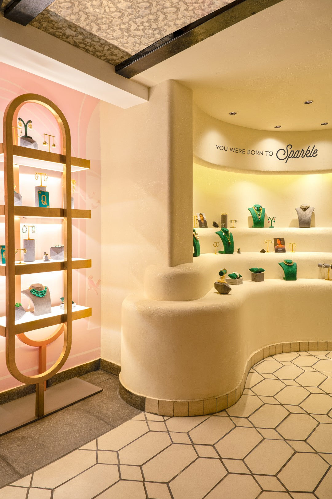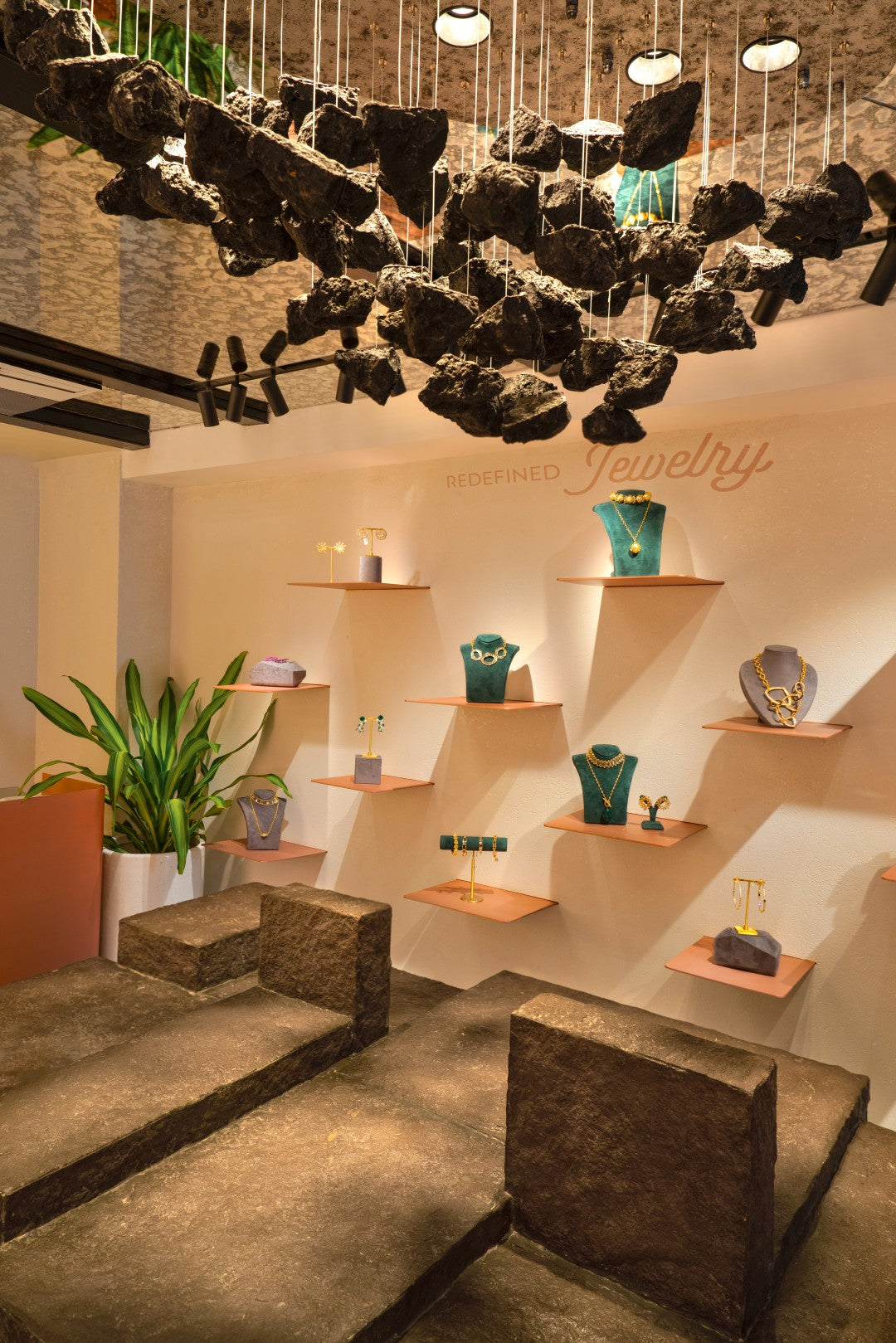 The evocative lighting structure, which suspends from the store ceiling at the center of the room, is inspired by lava rocks marking the geological genesis of gold. At another glimpse, a bespoke wallpaper depicting a local jewelry market with colonnades and arches juxtaposes with an otherwise contemporary space. Decidedly so, the store is an eclectic potpourri of several inspirations.