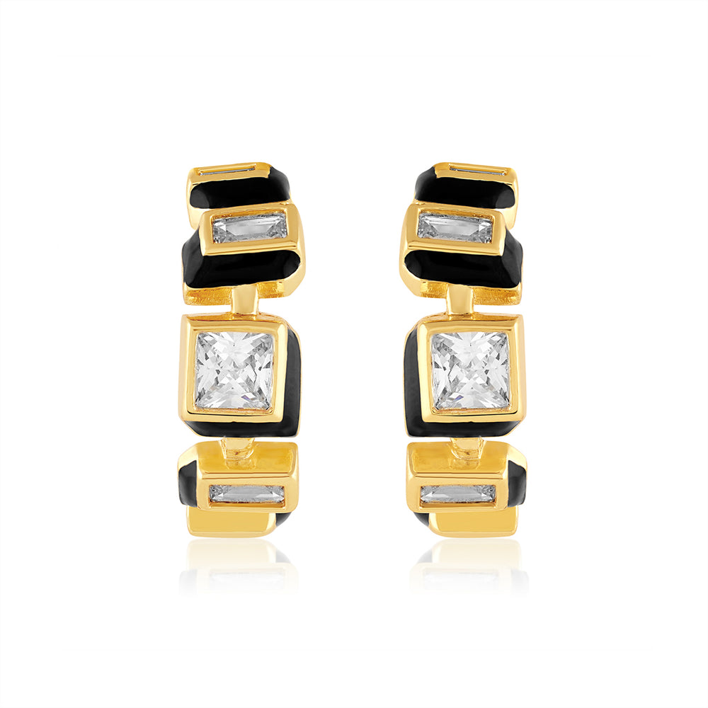 Introducing Our Sleek Black Squares Hoops, Featuring Gold Plating With E-Coating For A Lasting Shine. The Bold Black Enamel And Cz Stones Add A Touch Of Sophistication To Any Outfit. Made With Brass And Expertly Crafted, These Earrings Are Both Stylish And Durable.