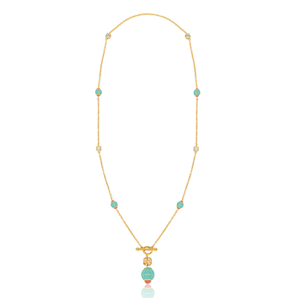 Bold and captivating, this long toggle necklace in blue, dark rose, and gold is a statement piece designed to turn heads. Crafted in 18k gold-plated brass with crystal zirconia and resin work, it’s inspired by whimsical garden motifs. Hypoallergenic and luxurious.