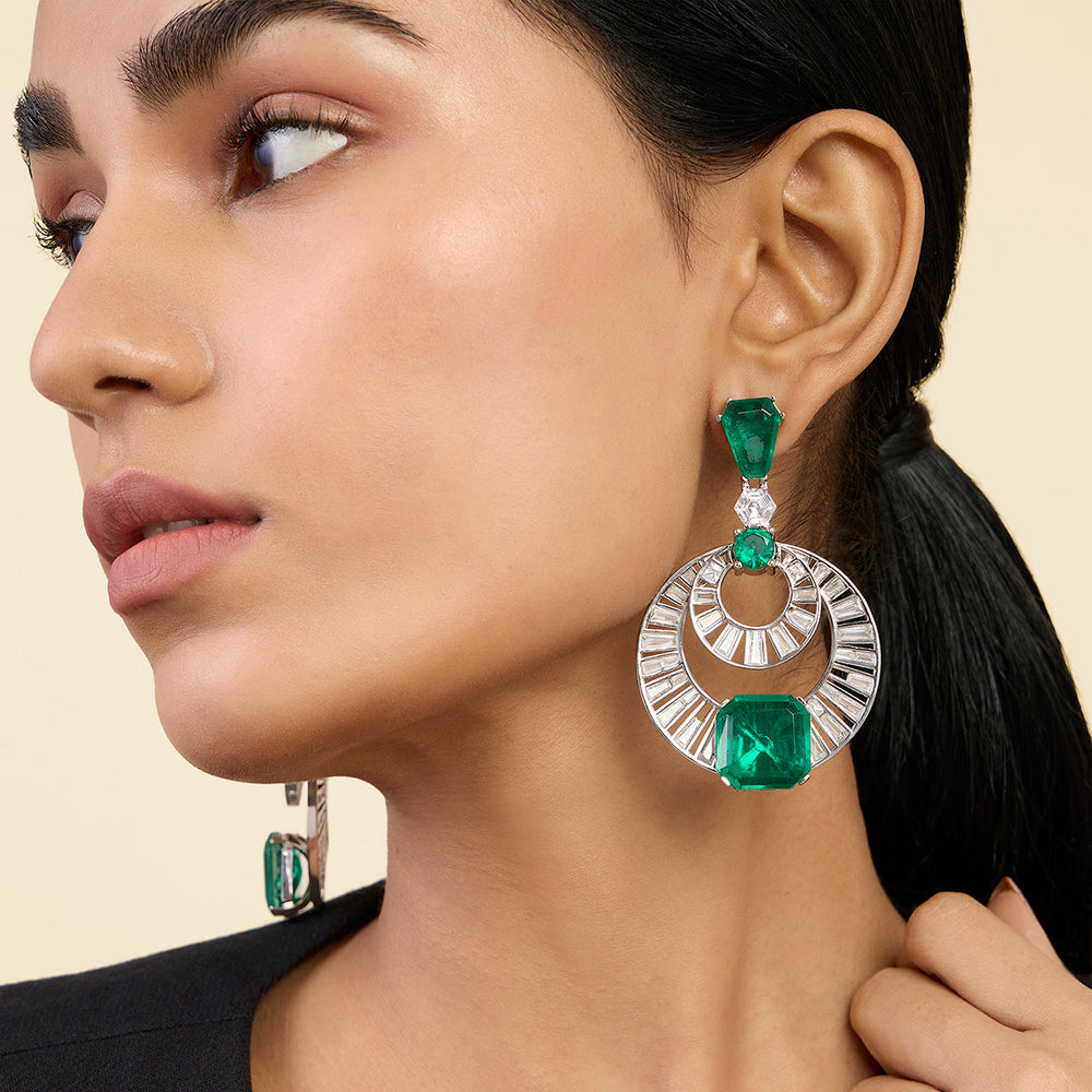 Elevate your festive looks with these Doublet Emerald Moon Bali Earrings. The custom-cut CZ stones and Doublet Dark emerald add an elegant touch, while the rhodium plating with e-coating ensures long-lasting shine. Made with high-quality brass, these earrings are the perfect plus-ones for any occasion.