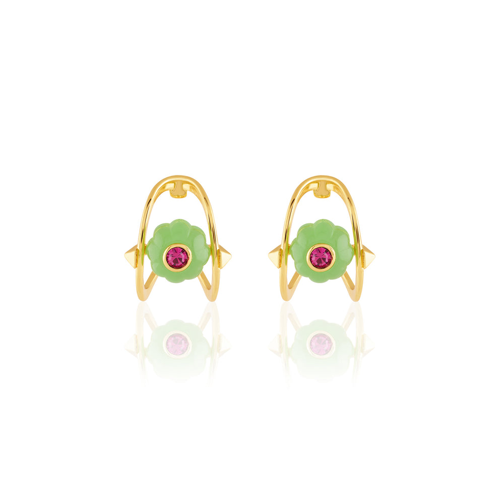 Chic and compact, these statement huggie hoop earrings in green, dark rose, and gold are perfect for on-the-go glam. Crafted in 18k gold-plated brass with crystal zirconia and resin work, they’re bold, hypoallergenic, and garden-inspired.