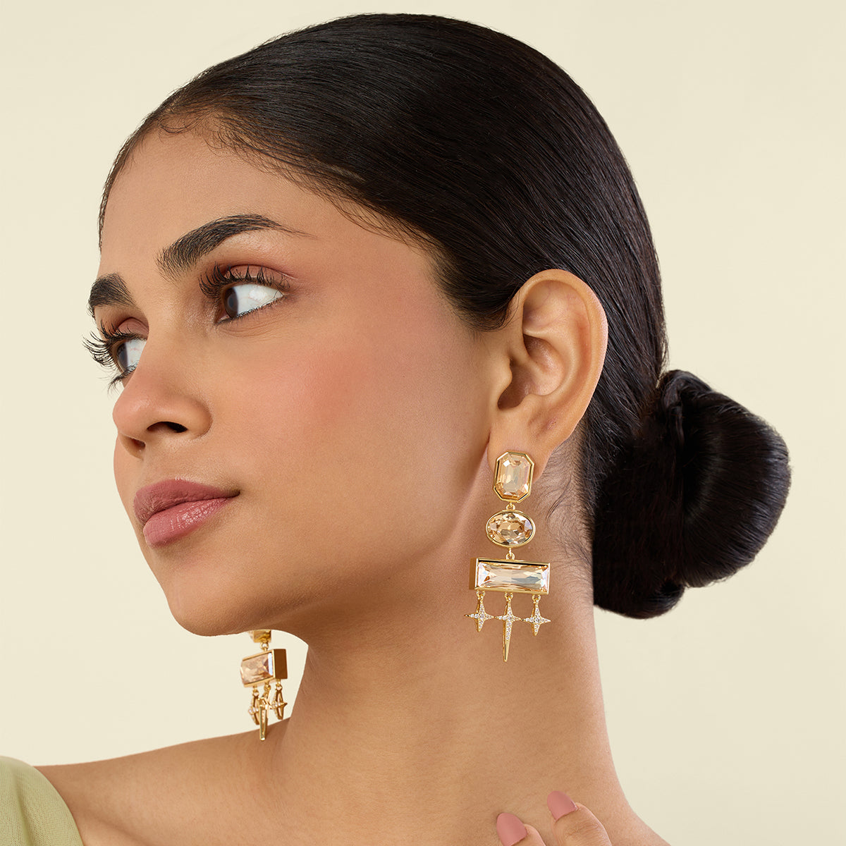 These Tarot-inspired dangler earrings are crafted in brass with 18k gold plating and high-quality crystals. Hypoallergenic and luxuriously light, they elevate weddings, cocktails, and celebrations alike. Style bold. Shop now.