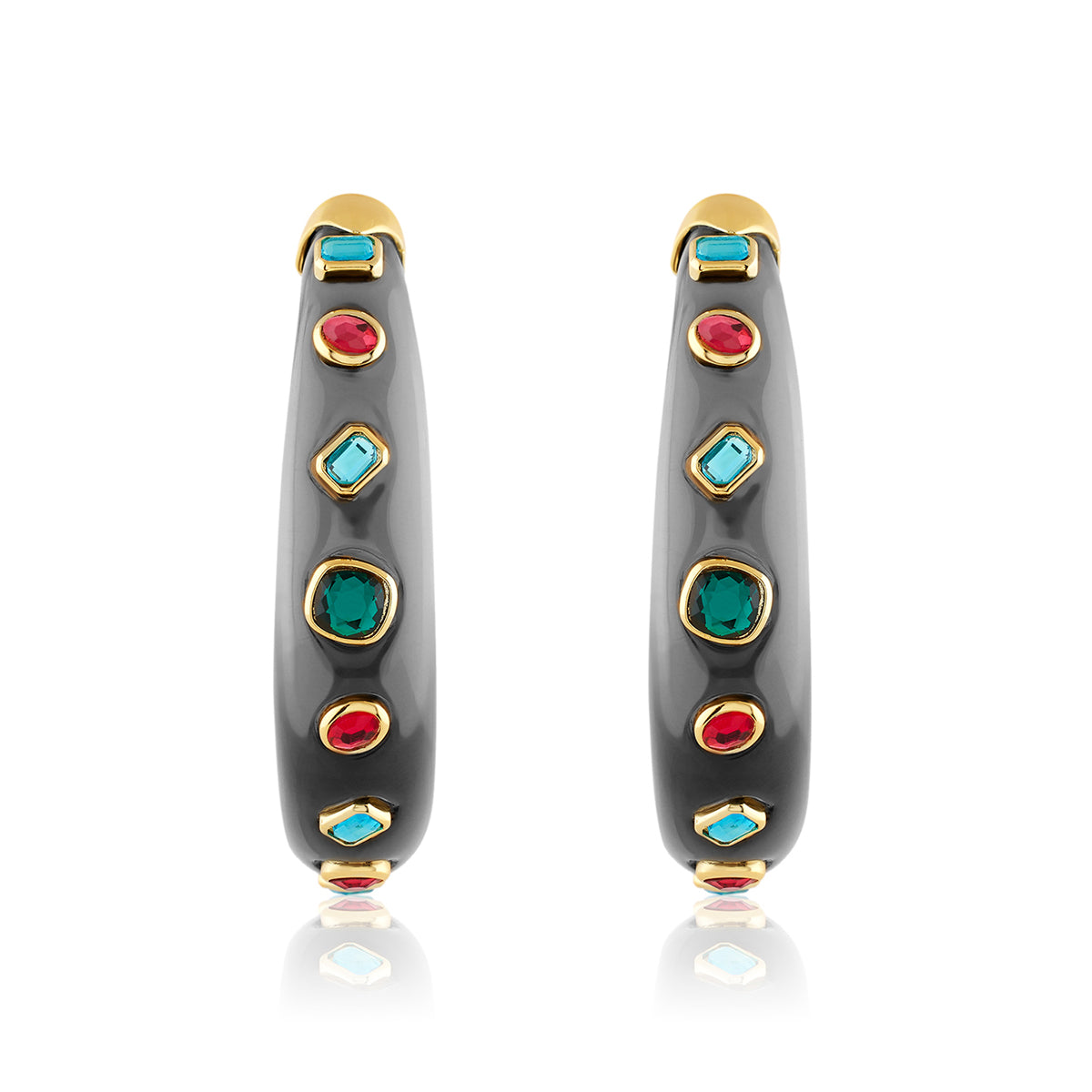 Elevate your look with this bold earring in black and gold, featuring crystal zirconia and resin work. Crafted from 18k gold-plated brass, it draws inspiration from whimsical garden motifs like flowers and dragonflies. Hypoallergenic and luxurious.