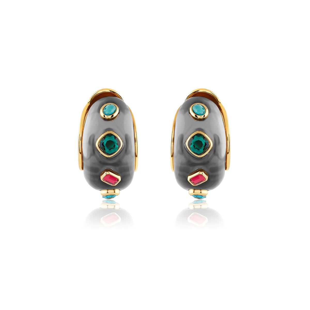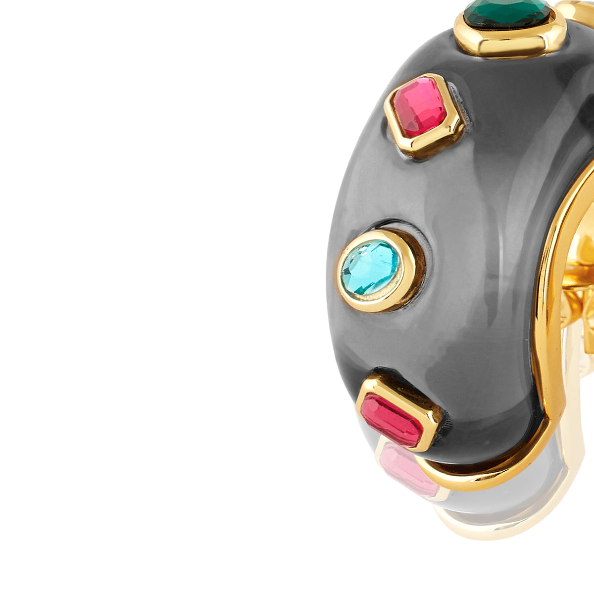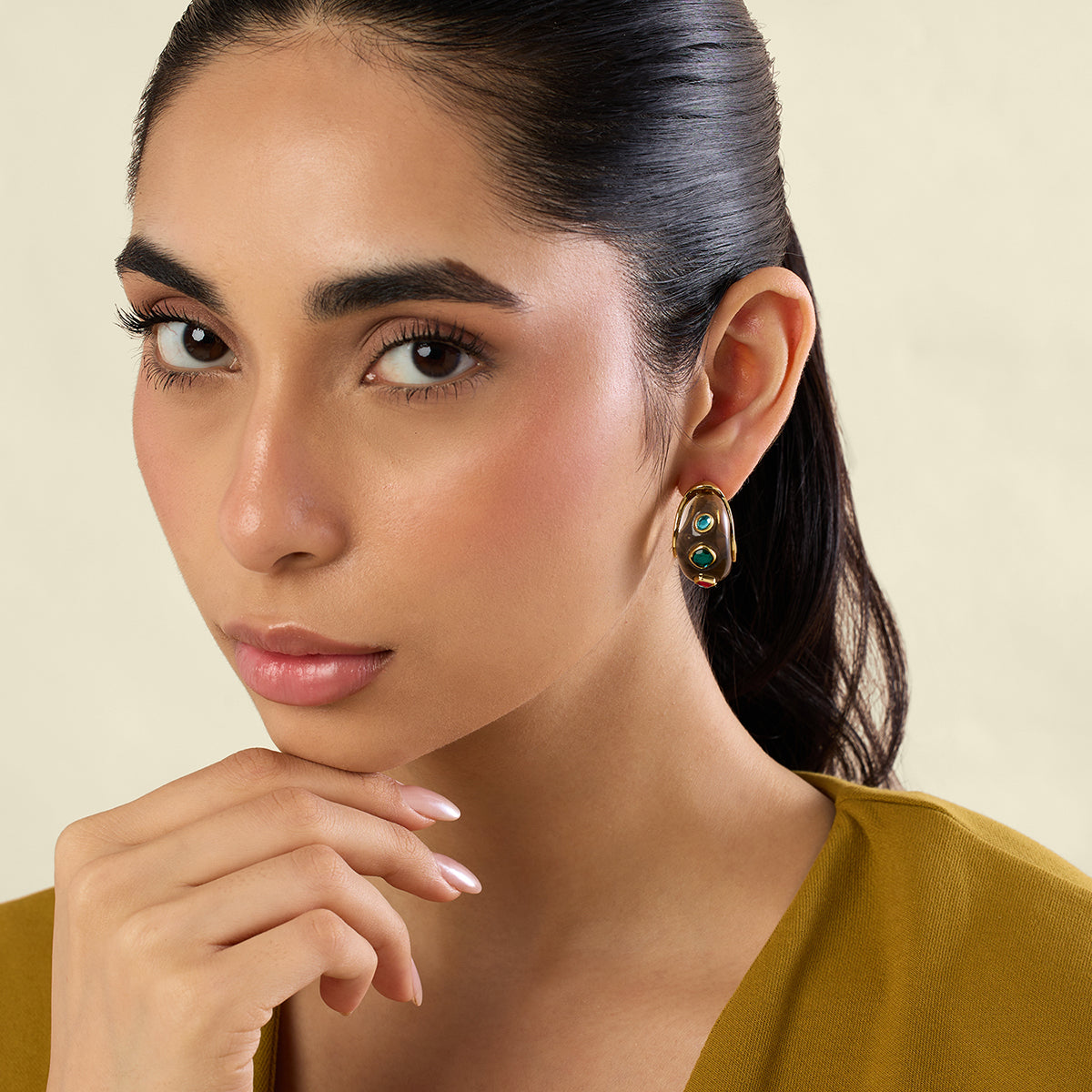 Elevate your look with this bold statement earring in black and gold. Featuring crystal zirconia and resin work, this piece is crafted from 18k gold-plated brass and inspired by whimsical garden motifs like flowers, snails, and dragonflies. Hypoallergenic and luxurious.