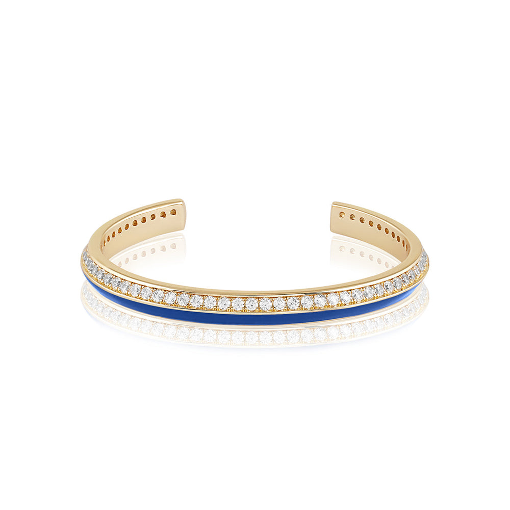 Add a touch of glam to your wrist with our Navy Disco Cuff Bracelet. Made of brass, this bracelet features sparkling CZ stones and vibrant blue enamel for a bold look. The gold plating with e-coating ensures durability and the cuff design makes it easy to slip on and off. Elevate your wristwear game with this gold plated beauty.