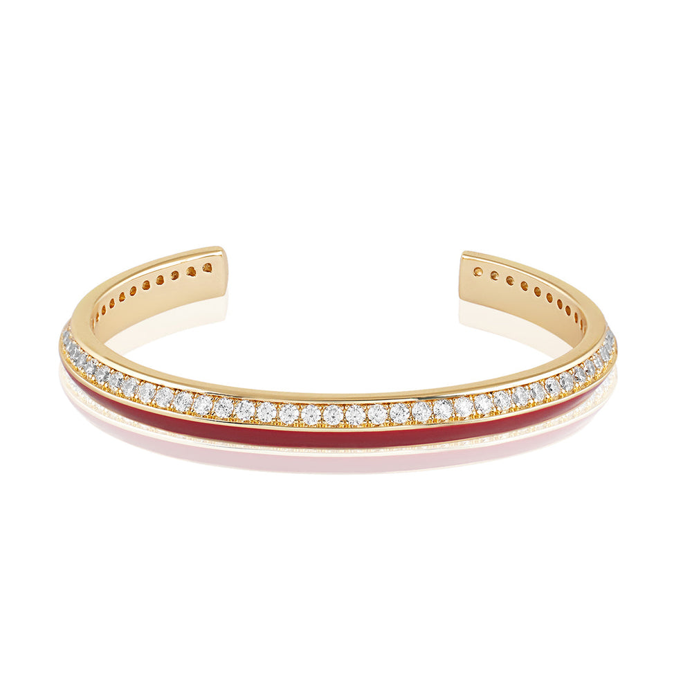 Dazzle in color with our Ruby Disco Cuff Bracelet. Made with sparkling CZ and vibrant red enamel, this bracelet is the perfect addition to any outfit. Crafted with high-quality gold plated brass, this cuff offers elegance and durability. Complete your wristwear collection with this statement piece.