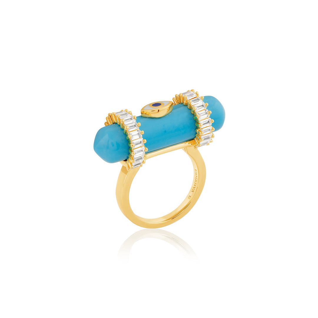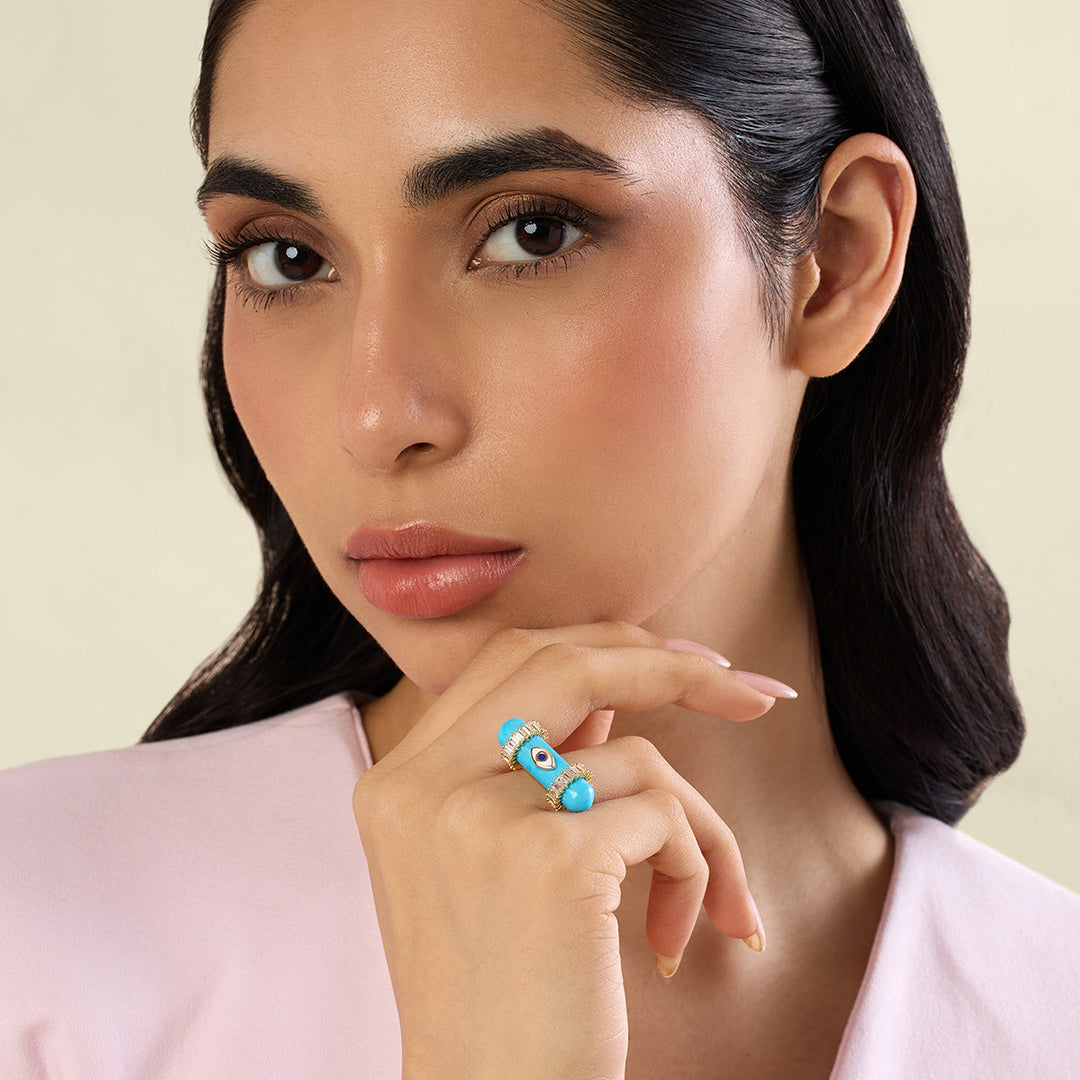 Channel calm and confidence with the Celestial Turquoise Amulet Ring. Featuring a healing turquoise stone, radiant white and blue enamel, and sparkling CZs, this 18k gold-plated beauty brings bold energy to your stack. Pair with breezy whites or festive fits for instant impact.