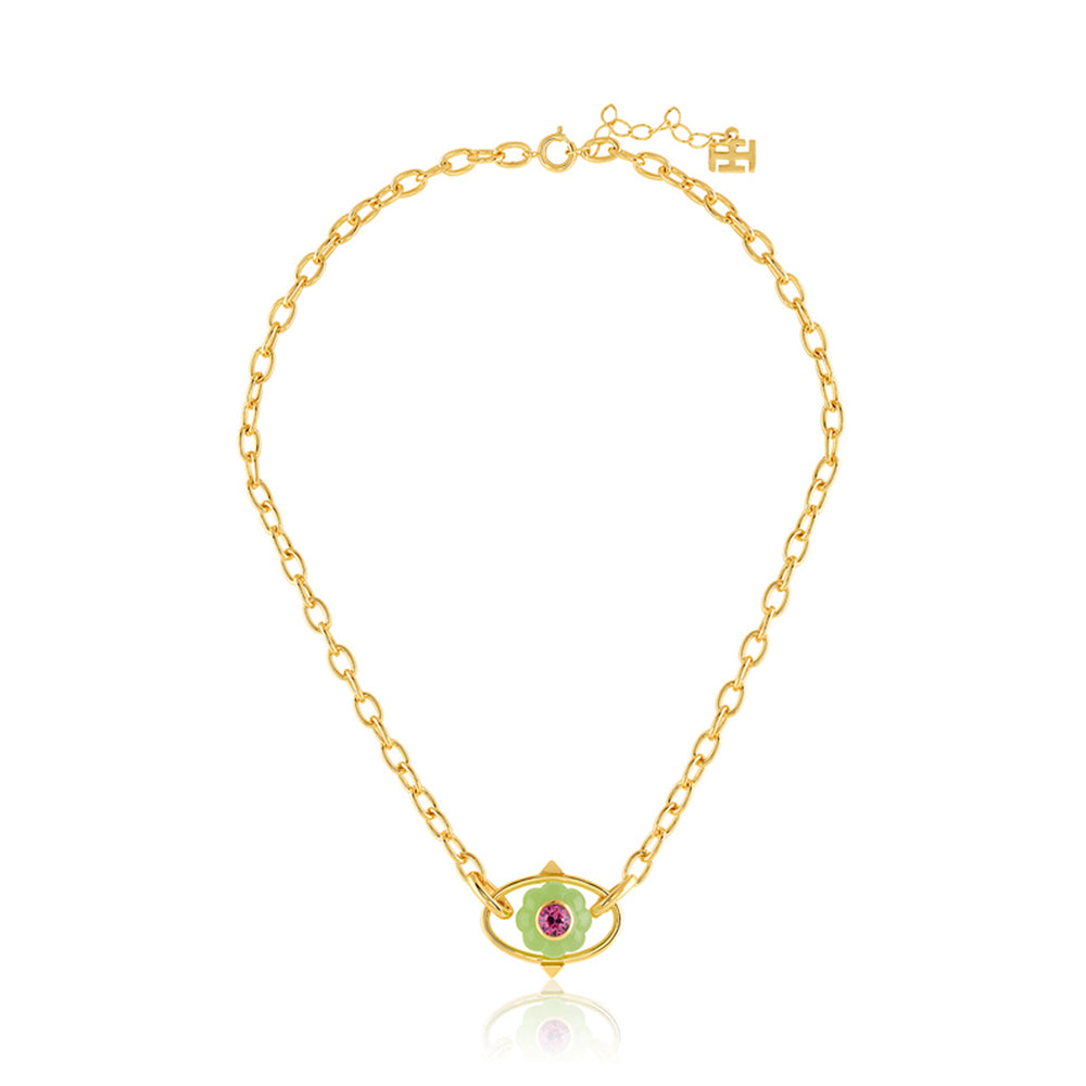 A stunning pendant necklace in green, dark rose, and gold that blends crystal zirconia, and resin work, creating a bold statement. Crafted from 18k gold-plated brass, it’s inspired by nature’s beauty—flowers, snails, and dragonflies. Hypoallergenic and luxurious.