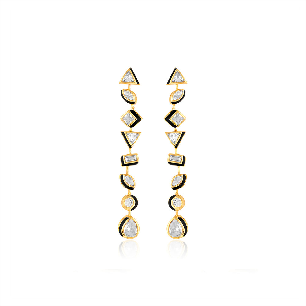 Crafted With Gold Plating And E-Coating, These Long And Elegant Earrings Are The Perfect Addition To Any Outfit. The Geometric Black Design Adds A Touch Of Sophistication, While The Enamel And Cz Elements Provide A Subtle Sparkle. Made With High-Quality Brass And Cz Materials, These Earrings Are Not Only Stunning But Durable As Well. Elevate Your Style With These Beautiful And Versatile Earrings.