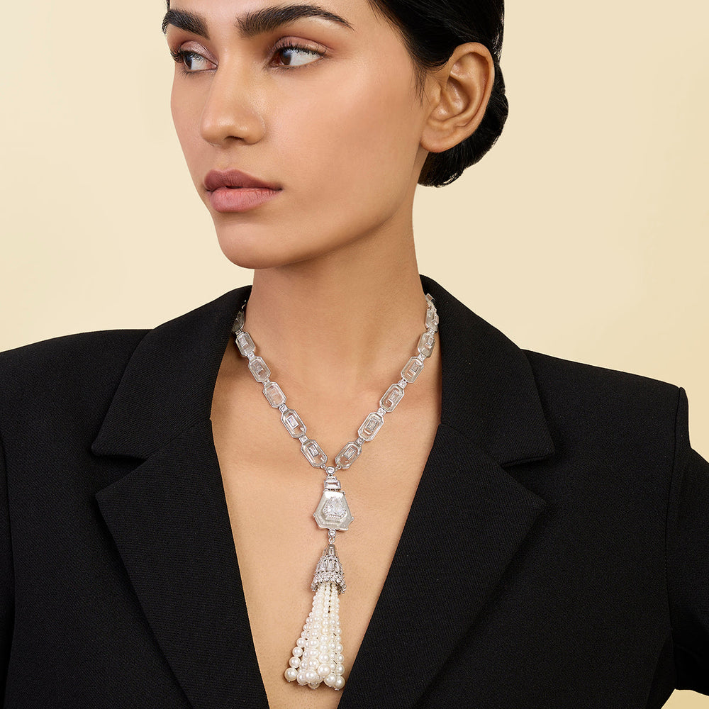 This elegant Long Pearl Tassel Necklace features rhodium-plated brass and is crafted with high-quality CZ stones, pearls, and resin. The tassel design adds a touch of sophistication to any outfit, making it perfect for formal occasions or otherwise.