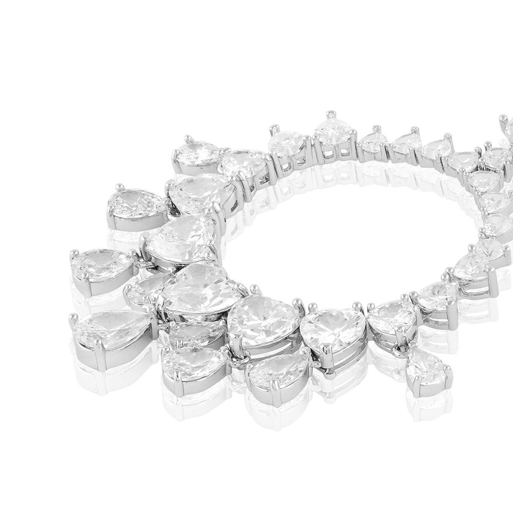 Step into the realm of luxury with the Lunar Elegance Moon Baalis from Isharya’s High Collection. Crafted with high-quality crystal zirconia and rhodium-plated brass, these silver and white moon-shaped earrings are the epitome of bold sophistication. Inspired by timeless tennis jewellery, they are perfect for social gatherings, parties, and festive occasions.