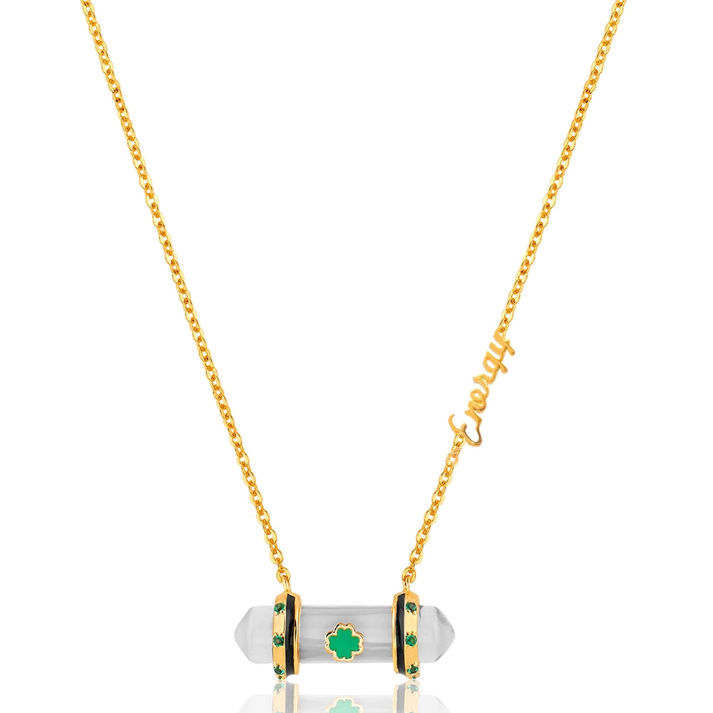 The Lunar Light Necklace features a radiant white crystal pendant framed with green enamel and crystal zirconia, set in 18k gold-plated brass. Hypoallergenic and statement-worthy, it’s inspired by spiritual clarity and healing energy.
