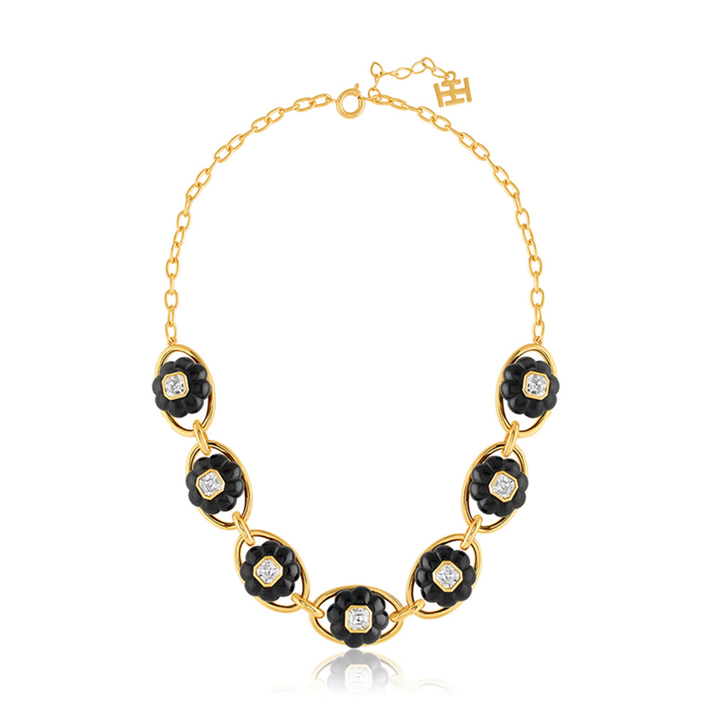 Make a statement with this bold collar necklace in black and gold. Crafted from 18k gold-plated brass, it features crystal zirconia and resin work, drawing inspiration from enchanting garden motifs. Hypoallergenic and sophisticated, it's designed to elevate your look.