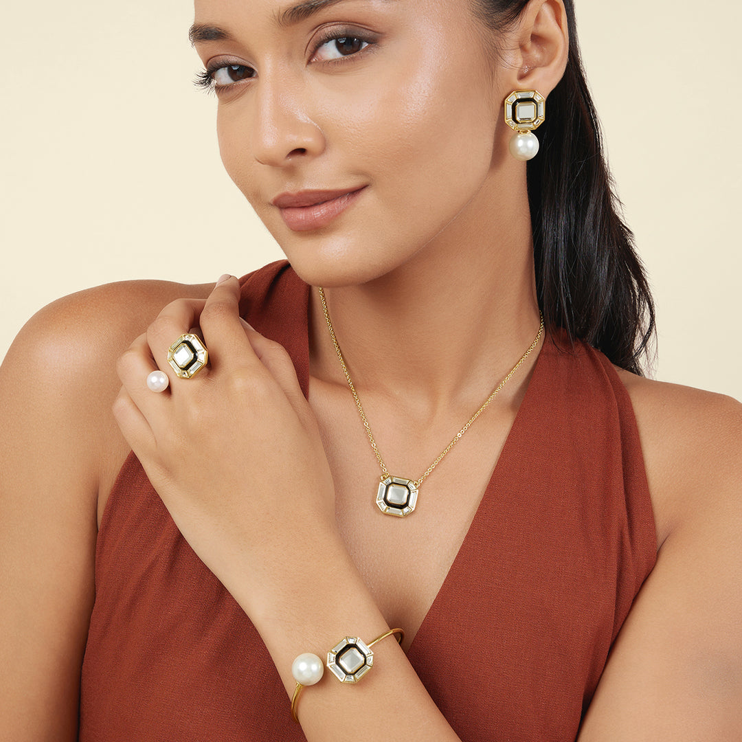 This elegant necklace, bracelet, ring, and earring set features bold hand-cut mirrors, enamel work, and pearls, all plated in 18k gold. Inspired by the Art Deco era, it offers timeless luxury with a modern twist. Hypoallergenic and crafted in brass, this set is designed to elevate your look for social gatherings, parties, or everyday wear.