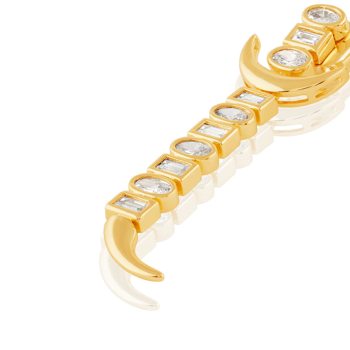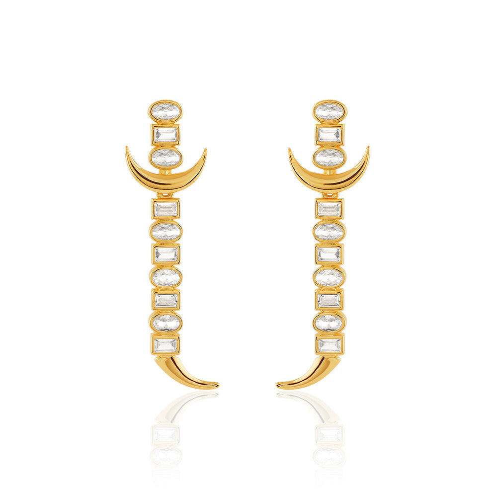 The Powerblade Danglers are bold sword-inspired earrings crafted in 18k gold-plated brass with white crystal zirconia. Hypoallergenic and statement-making, they channel protection, power, and presence.