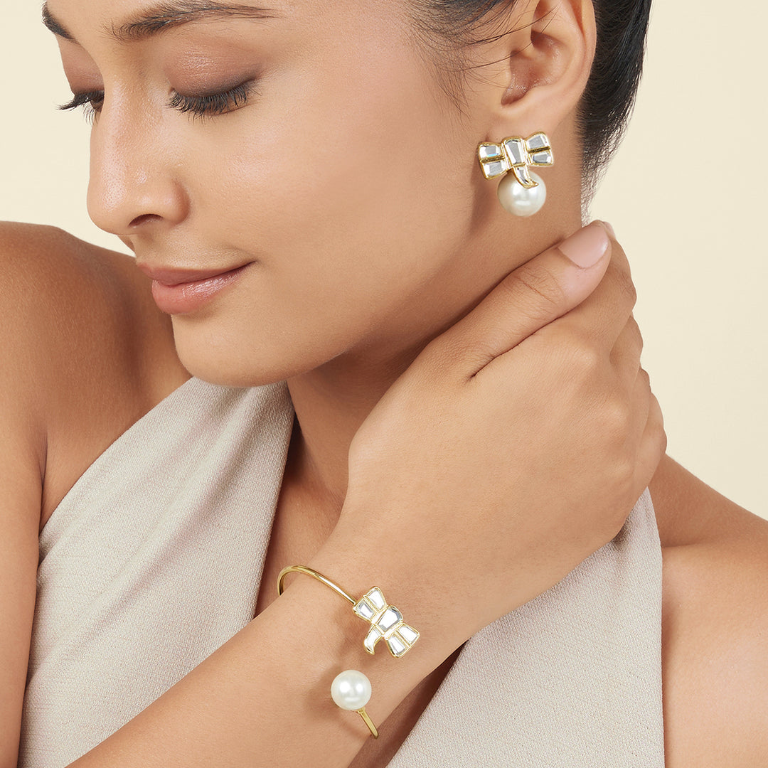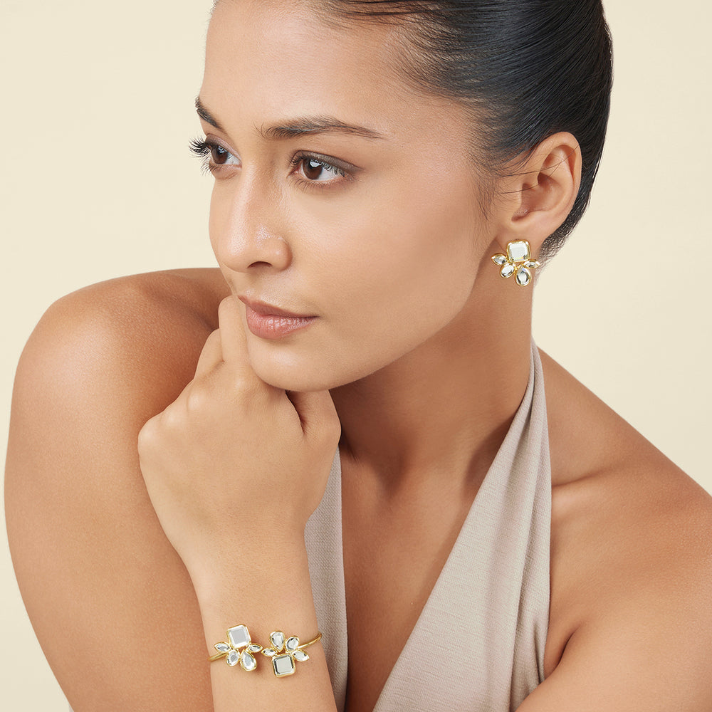 The Regal Trunk Mirror Set features a majestic elephant cuff and coordinating earrings adorned with hand-cut mirrors, pearls, and 18k gold plating. Hypoallergenic and rich in symbolism, it’s bold yet graceful.