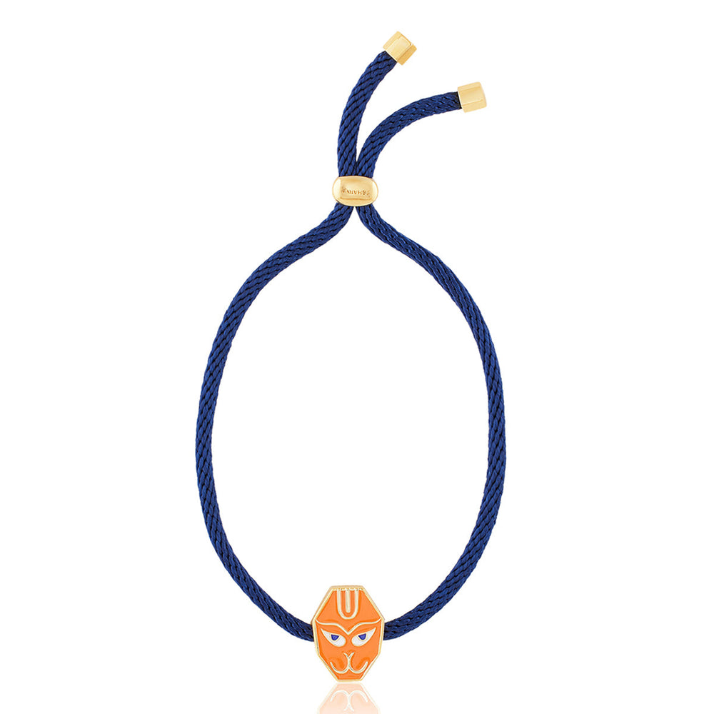 The Veer Rakhi Bracelet is a bold Raksha Bandhan piece featuring a Hanuman motif with orange enamel and crystal zirconia, set on a blue cord with 18k gold-plated brass. Hypoallergenic and powerful, it blends spiritual symbolism with modern design.