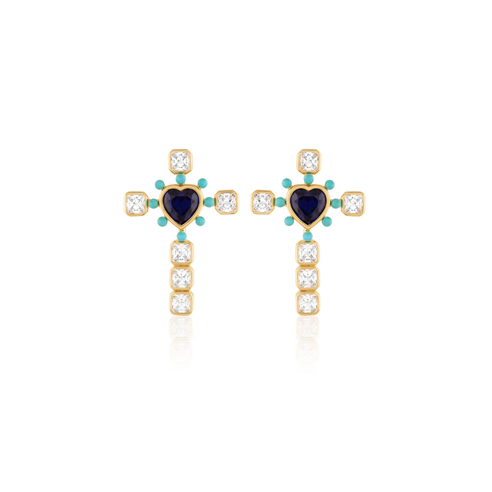 Inspired by the playful spirit of summer, these earrings are crafted in brass and plated with 18k gold. Featuring brilliant crystal zirconia and lapis lazuli stones, these lightweight earrings offer the perfect pops of colour to everything from sundresses to linen shirts.