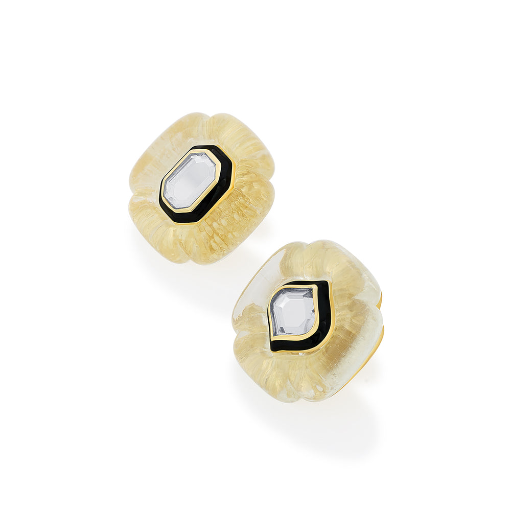 The sweet spot between tradition and new-age fashion, this pair of 18K gold-plated earrings is crafted from beautiful lucent resin, mismatched mirror motifs and accented with inky enameling. Its beauty lies in the ability to see hints of gold peeking through the resin.