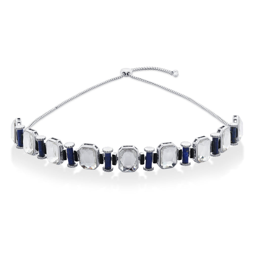 Our Digital Blue Crystal Choker combines crystals, CZ, and blue lapis, enhanced with Rhodium and Isharya's signature colored plating.