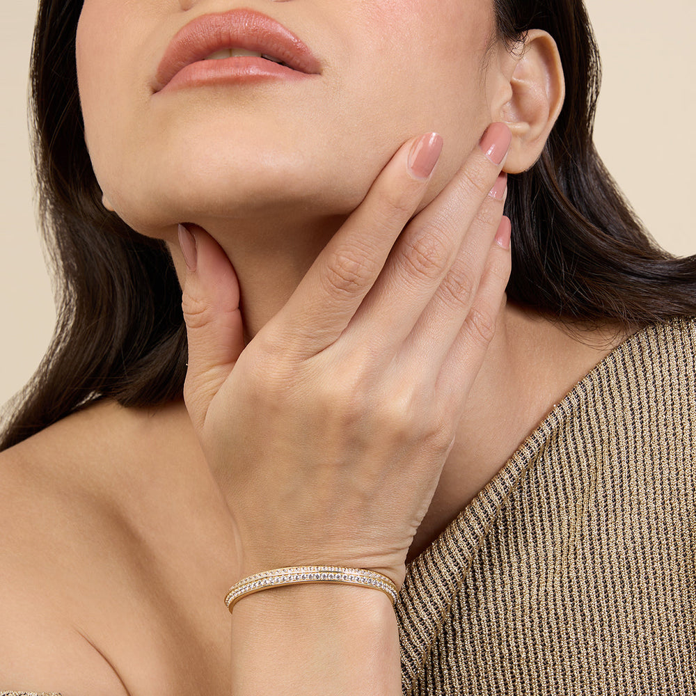Add some sparkle to your ensemble with our Disco Lights Cuff Bracelet. Made with CZ and brass, our gold plated cuff features e-coating for long-lasting shine. The perfect wristwear for any occasion.