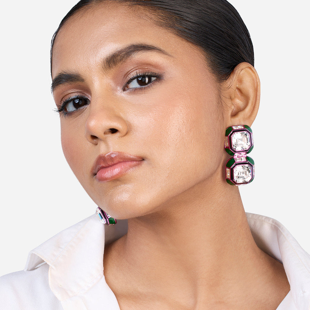 Our Jungle Green Oversized Double Crystal Studs feature dazzling crystals and our signature green plating. Wear them with with a crisp white shirt or go all out with a color blocked look.