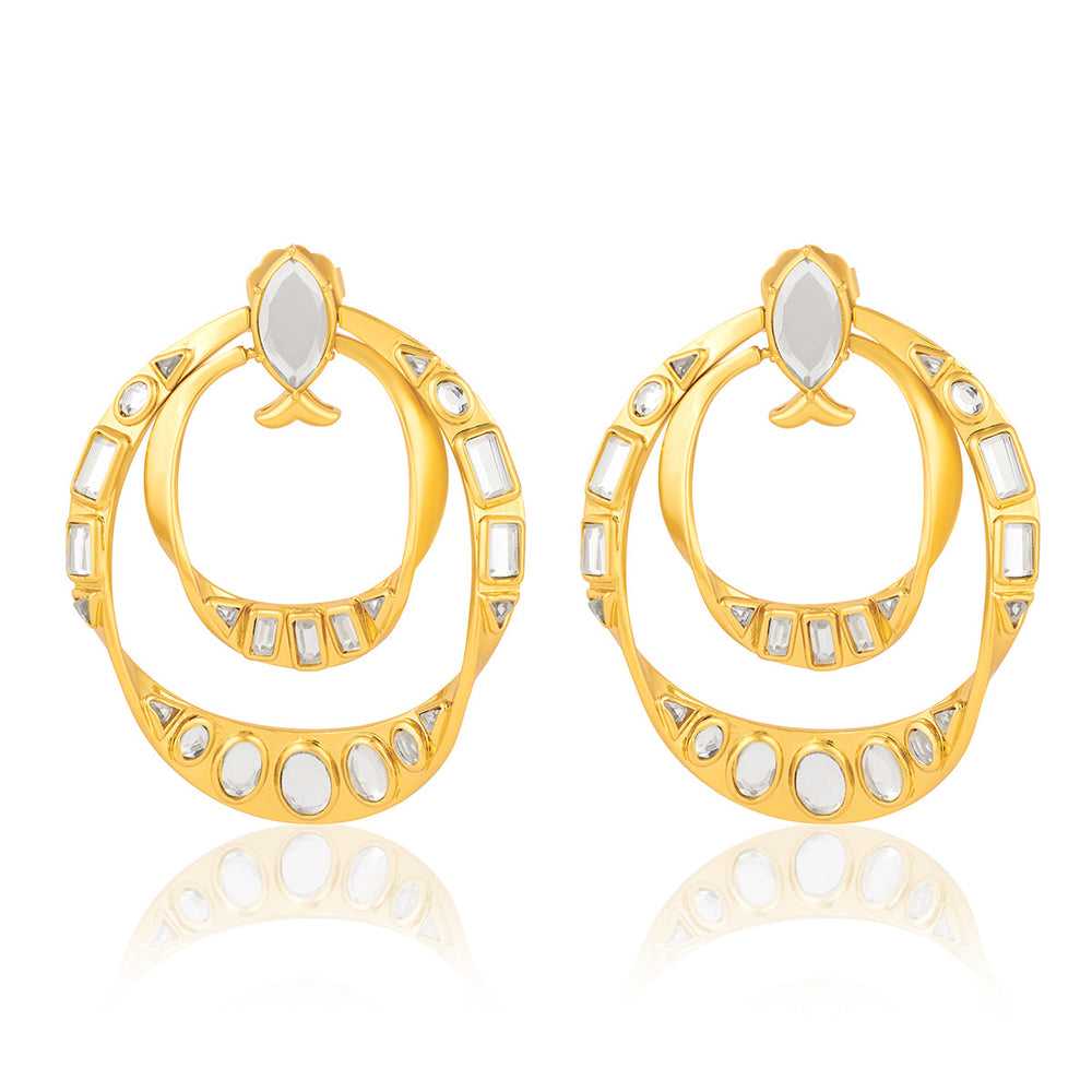These vintage-inspired Modern Indian Moon Balis are crafted in brass and plated with 18k gold. They feature exquisite mirror work and can be styled with everything from heirloom sarees to cocktail dresses for every celebration.