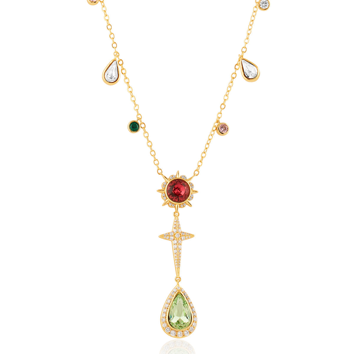 Turn every head this season with our multicolour statement necklace, crafted in brass with 18k gold plating. Adorned with crystal zirconias and cabochons, it draws from cosmic constellations and ancient symbolism. Perfect for weddings, cocktails, and festive soirées.