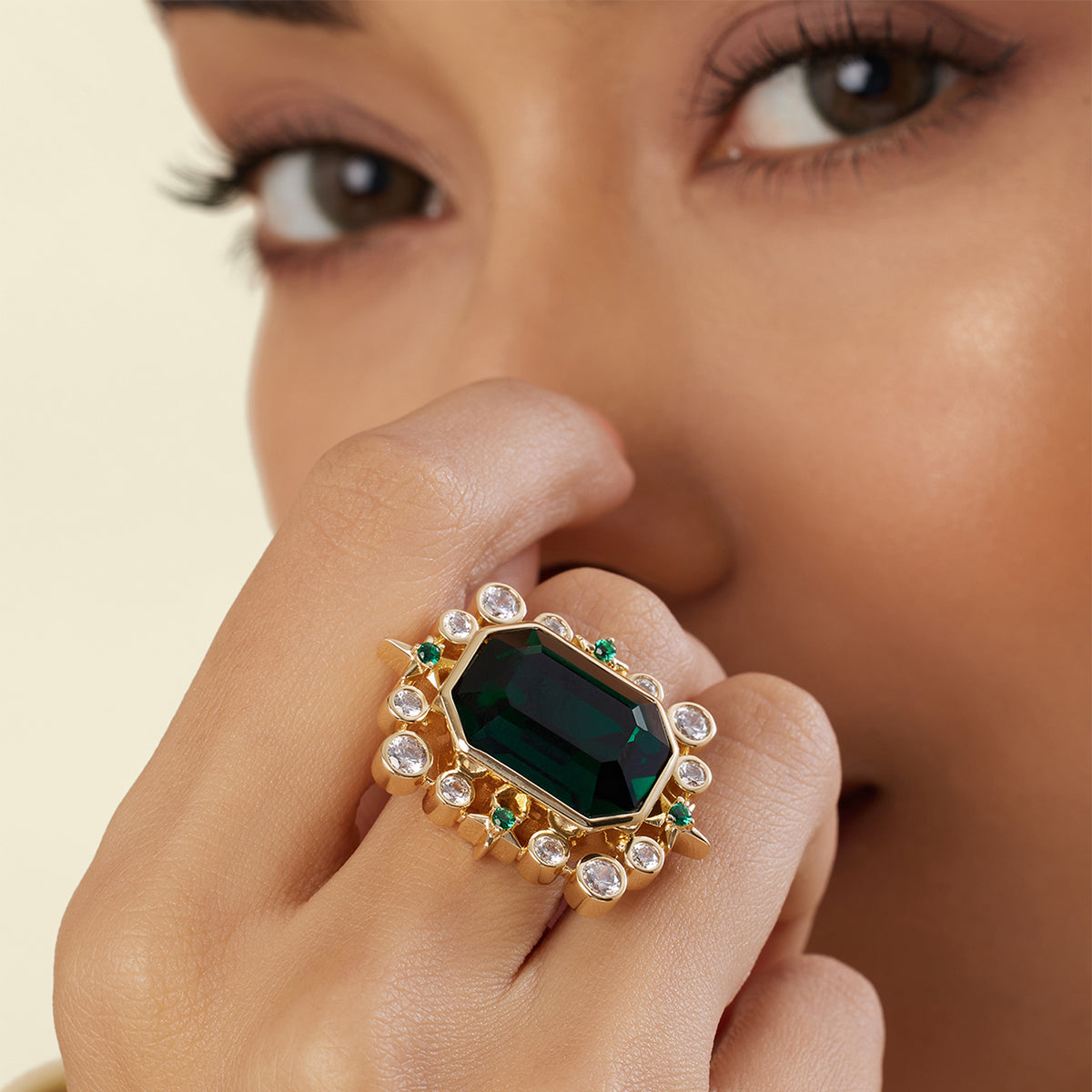 Crafted in brass with 18k gold plating, this multicolour ring dazzles with crystal zirconias. Inspired by cosmic constellations, it’s the perfect statement piece for weddings, cocktail parties, and festive soirées. Hypoallergenic and unforgettable—shop now.
