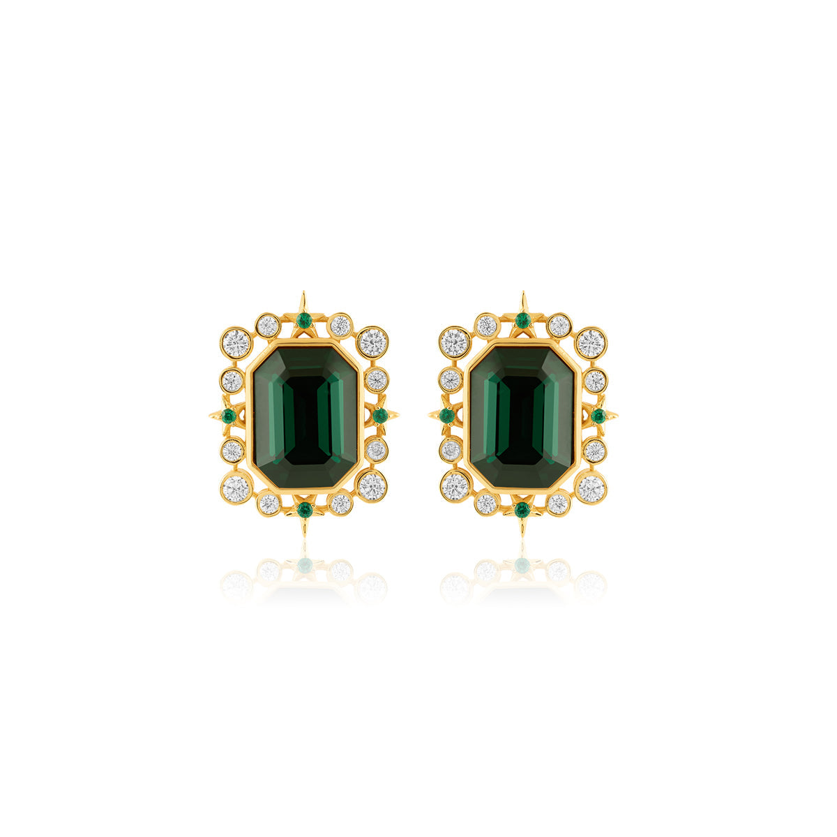 lluminate every occasion with these statement earrings, crafted in brass with 18k gold plating. Featuring crystal zirconia stones, they echo cosmic constellations and ancient symbolism. Perfect for weddings, cocktails, and festive nights.