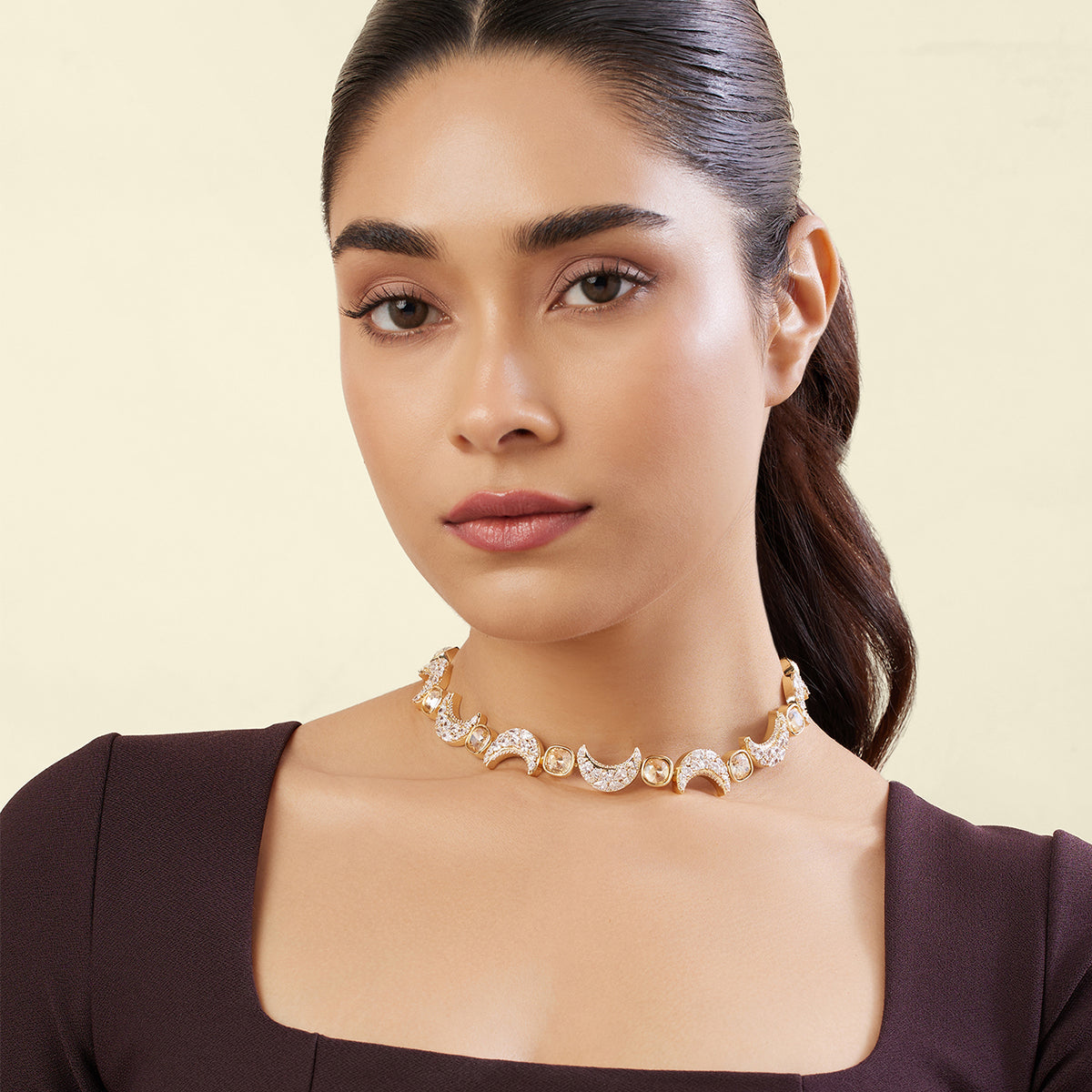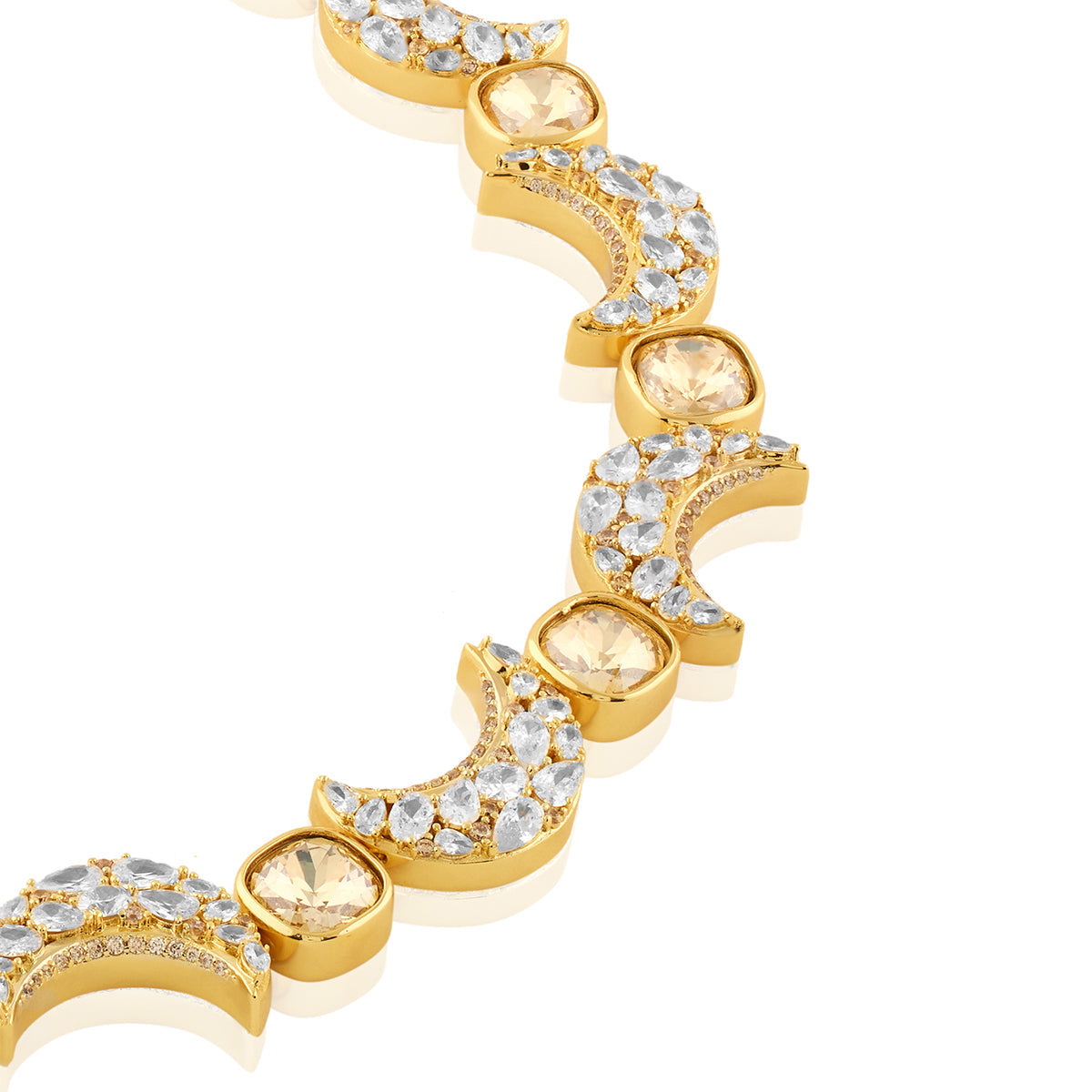Turn every head this season with our multicolour statement necklace, crafted in brass with 18k gold plating. Adorned with crystal zirconias, it draws from cosmic constellations and ancient symbolism. Perfect for weddings, cocktails, and festive soirées.