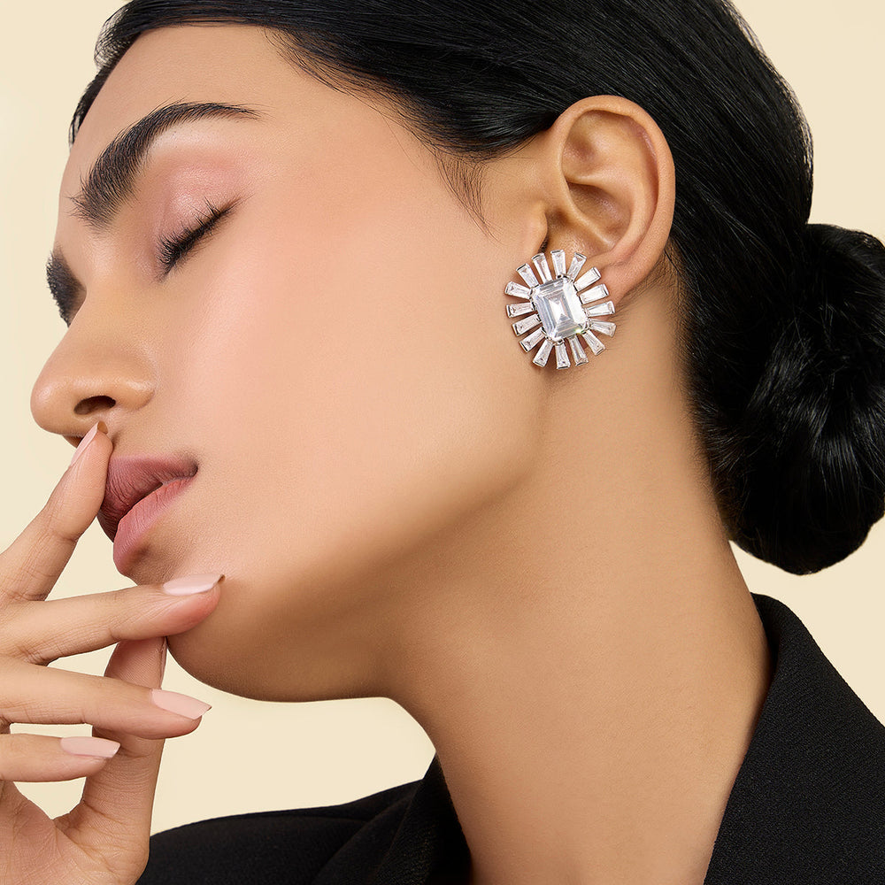Expertly crafted Art Deco statement studs featuring custom-cut CZ stones set in brass with luxurious rhodium plating. These Art Deco-inspired stud earrings are perfect for adding a touch of glam to any outfit.