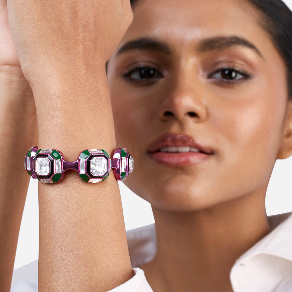 The Hyper Pink Deco Cuff is adorned with sparkling crystals and our signature colored plating in pink and green. Wear it for all your big night outs.