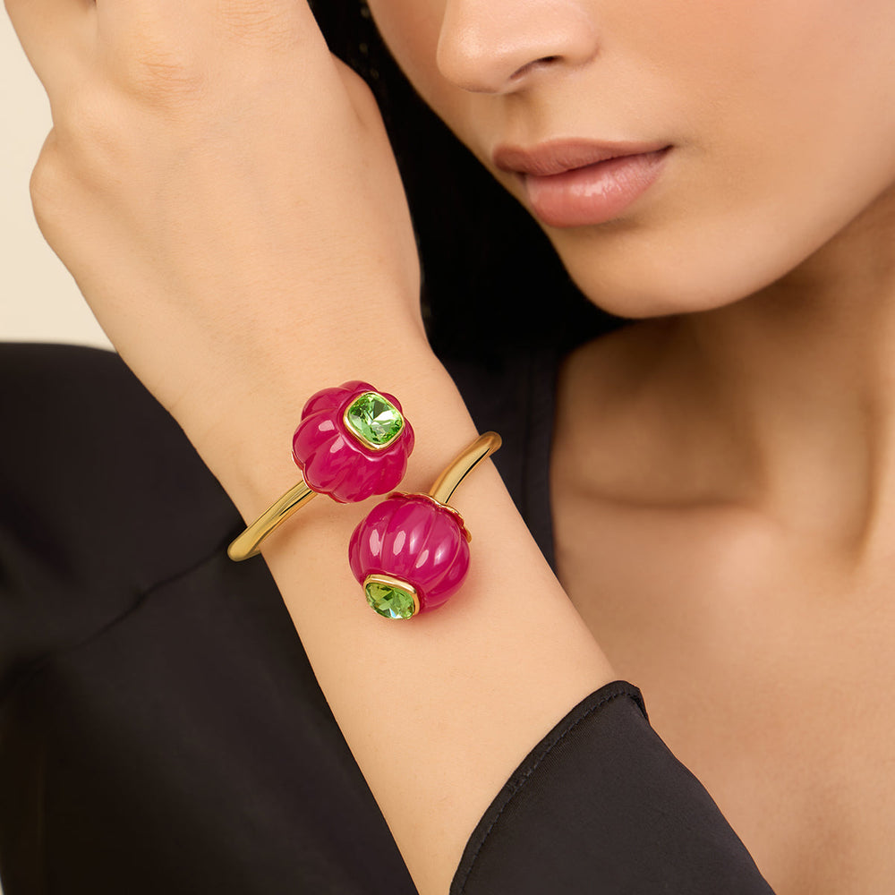 Experience elegance and luxury with our Pink & Aqua Open Cuff. Made with pink crystals and 18-karat gold plating, this cuff is a chic addition to any outfit. Its open design allows for a comfortable fit while adding a touch of sophistication. Elevate your style with this exclusive piece.