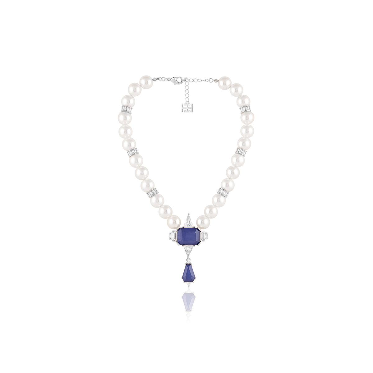 Inspired by the Art Deco era, this white and blue necklace stuns with crystal zirconia and Botox sapphires. A rhodium-plated brass masterpiece, hypoallergenic and luxe—ideal for cocktail nights and celebrations. Own your statement look today.