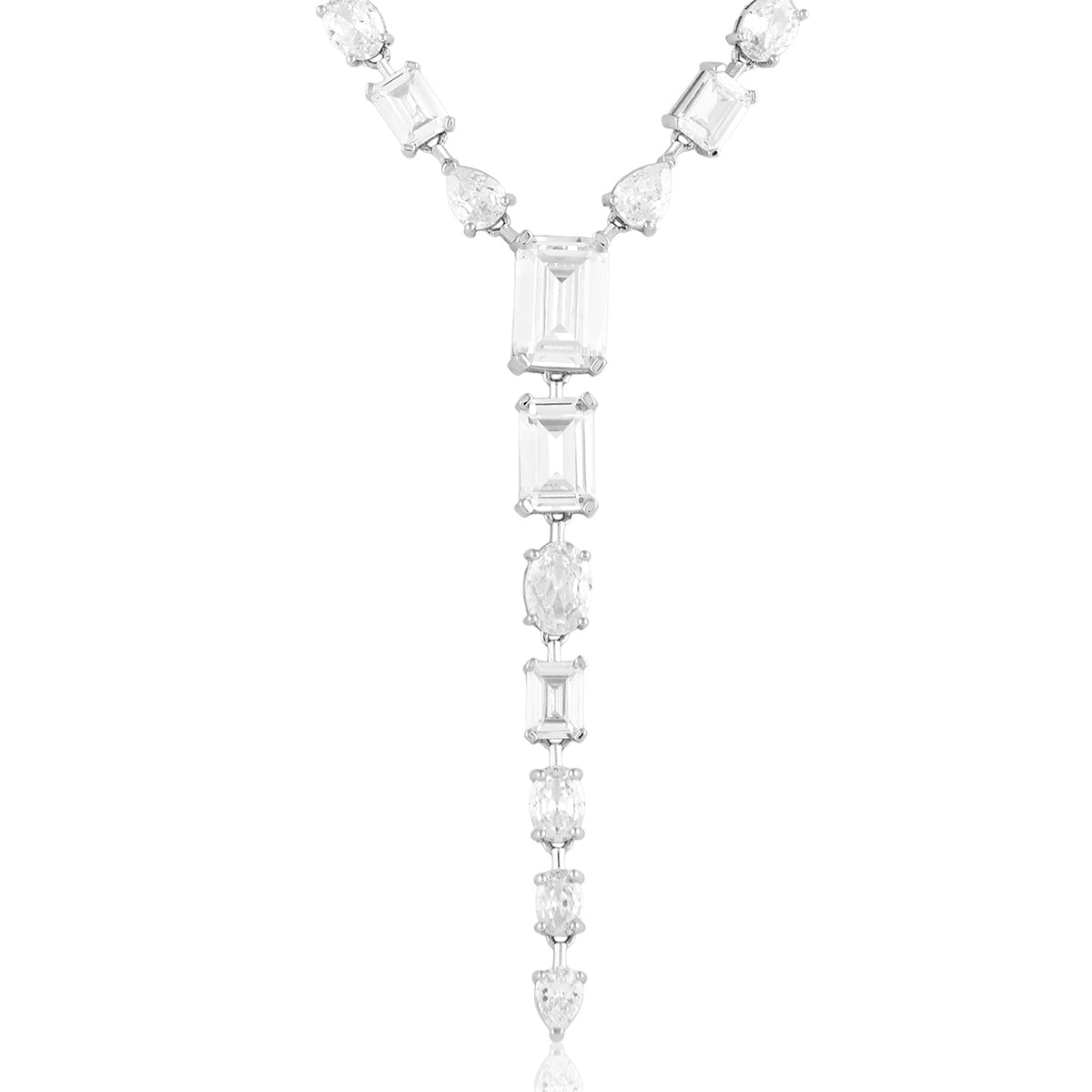 Inspired by the Art Deco era, this Y necklace stuns with special cut crystal zirconia stones. A rhodium-plated brass masterpiece, hypoallergenic and luxe—ideal for cocktail nights and celebrations. Own your statement look today.