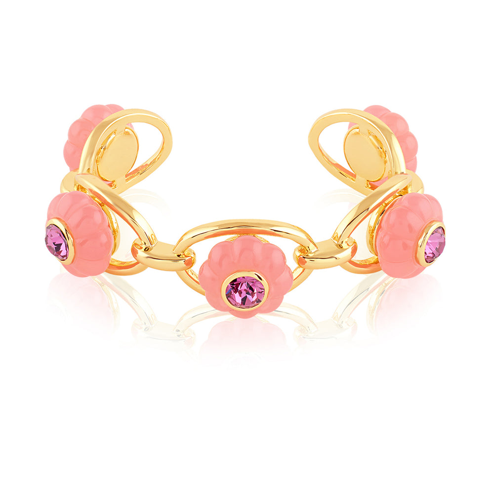 Bold and beautiful, this statement cuff in pink, dark rose, and gold features exquisite crystal zirconia and resin work. Crafted in 18k gold-plated brass, it’s inspired by nature’s charm—flowers, snails, and dragonflies. Hypoallergenic and luxurious.