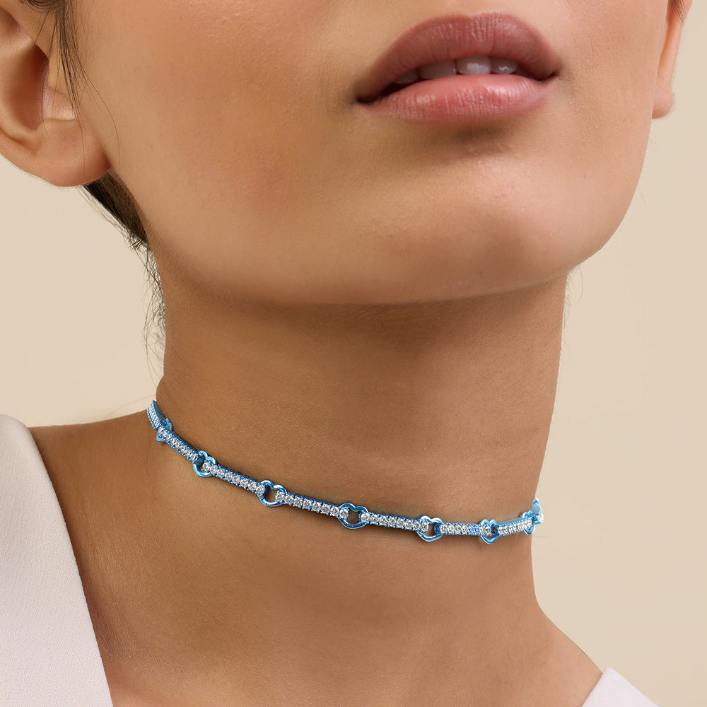 Be bold and beautiful with our Blue Link Necklace. Perfect for everyday wear or dressing up for a party, this Isharya Signature Colored Plating piece features a vibrant blue CZ and a unique Collar Necklace design.