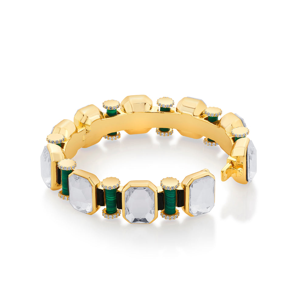 The Jungle Green Crystal Bangle features CZ, crystals and green Malachite. It's contrasted with 18Kt gold plating and Isharya's signature colored plating.